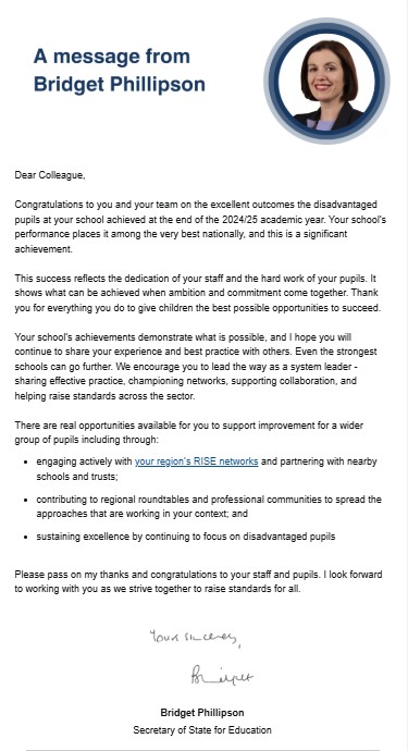 Halley House School, Kilburn Grange School, and Whiteknights Primary School have each received a letter of congratulations from Bridget Phillipson, Secretary of State for Education, recognising their exceptional outcomes for disadvantaged pupils in the 2024/25 academic year. The letter was sent to the top 25 per cent nationally, based on outcomes for disadvantaged pupils.